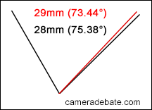 28mm is equivalent to approximately 75.38° diagonal FOV and 29mm is equivalent to 73.44° FOV. By having a wider FOV you’ll be able to get a bit more into the frame, but it’s a very small difference.